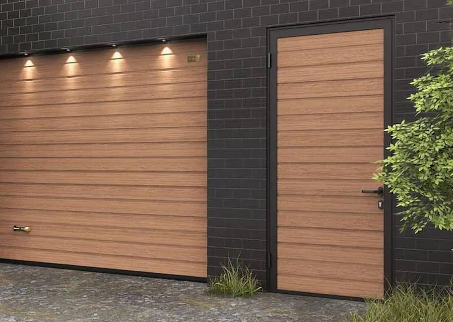 Секционные двери в гараж обеспечивают удобный пешеходный доступ и упрощают рутинные задачи. Вам не придется поднимать массивное полотно, чтобы зайти в гараж или выйти из него. Боковые двери гармонично сочетаются с гаражными воротами.