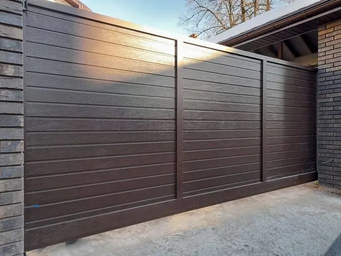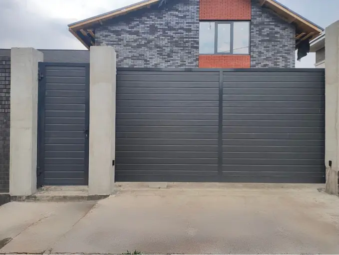 Заказали откатные ворота и калитку с сендвич-панелями Алютех. Стильный дизайн, хорошее качество!